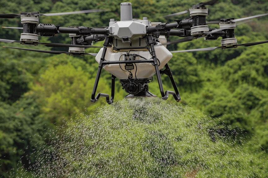 Spraying pesticides is the most common use of agricultural drones. The T100 has a spraying load of 75 kg, and the maximum flow rate of the dual nozzles is increased to 30 liters per minute. The droplet size is adjustable from 50 to 500 microns, which can meet the large flow operation scene without additional configuration.