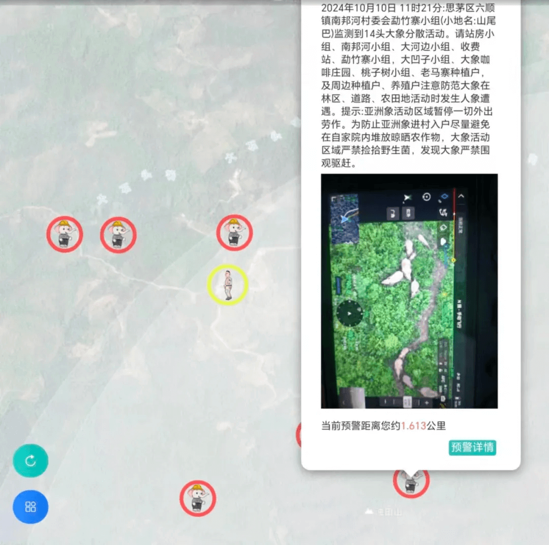 Last July, a drone infrared camera captured a herd of elephants walking to a restaurant, less than 100 meters from the road. The staff immediately used the drone to shout warnings, reminding nearby farmers to stop working and that the road was closed. For five consecutive days, the staff kept a close eye on the elephants' movements throughout the day. The drone flew more than 60 times, covering more than 300 kilometers, and found a total of 43 elephants, ensuring the safety of people and elephants.