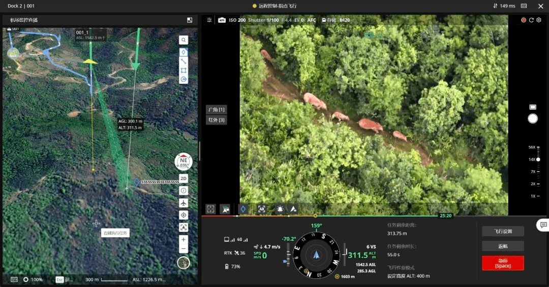 Asian elephants do not have fixed homes and their activities are random. When an emergency occurs, the staff can remotely take over through the DJI Skylon 2, control the drone to quickly fly to the destination for inspection, and help the team understand the situation on the scene in a timely manner.