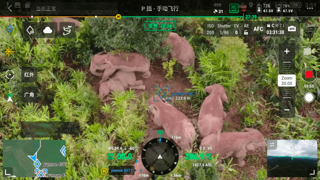In the emergency rescue of Asian elephants, the high-definition images taken by drones provided important support for the rescue. In the daily management of Asian elephants, relevant units in Xishuangbanna introduced dozens of drone equipment, including DJI Airport 2 and DJI M350 RTK equipped with Zenmuse H30T, using laser dot positioning, infrared and other functions to monitor Asian elephants in a scientific way and protect the elephant herd.