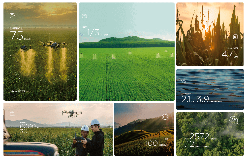 "Green mountains and clear waters are worse than mountains of gold and silver." Agricultural drones, through electric drive and precise fertilization and pesticide application, bring us one step closer to the goal of low-carbon emission reduction. In the field management link, the application of agricultural drones can save 29 liters of water per mu compared with manual operations; at the same time, the precise operation of drones can reduce the use of pesticides and fertilizers, reduce greenhouse gas emissions, and help reduce the carbon footprint of agricultural production. The 7.5 billion mu of operating area can save a total of 210 million tons of water, which is equivalent to the annual drinking water consumption of 390 million residents; the cumulative reduction of 25.72 million tons of carbon emissions is equivalent to the annual carbon fixation of 1.2 billion trees; equivalent to a reduction of 47,000 tons of pesticide use.