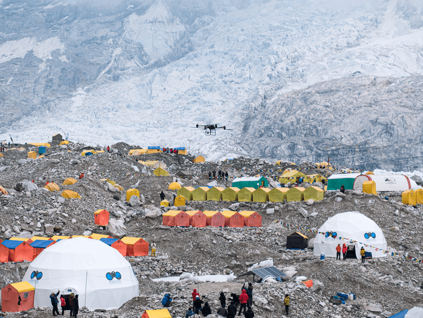 Mingma G revealed that it takes an average of about 6-8 hours for Sherpa guides to cross the Khumbu Icefall, with a maximum load of 15 kilograms each time. If they are unlucky, they are likely to get into trouble. Last year, three Sherpa guides in his team died here. DJI's drone can deliver 15 kilograms of supplies between camps in just 12 minutes during the day or at night, which gives them a new way to reduce casualties. "The test results of drones on Mount Everest are very good. This means that soon, we can use drones to deliver equipment to Camp C1 day and night, and we can also use drones to transport all the remaining garbage and excrement from the upper camps. We don't have to cross the icefall frequently at night, and we don't have to endure the cold. It will definitely help save more lives." Partner Wang Yuanzong recalled that in high-altitude mountaineering activities, the use of oxygen is the choice of most people, and oxygen is also considered one of the most basic guarantees in the industry. When the drone successfully delivered 3 oxygen bottles for the first time and returned smoothly with the garbage, climbers from all over the world who stopped around the South Slope Base Camp collectively applauded and cheered.